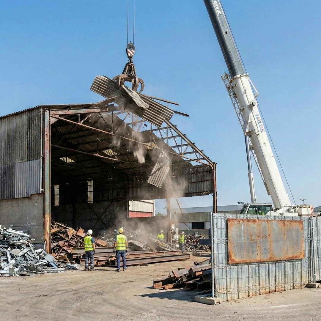 Servicio de desmontaje de naves industriales, maquinaria pesada y estructuras metálicas con personal capacitado.